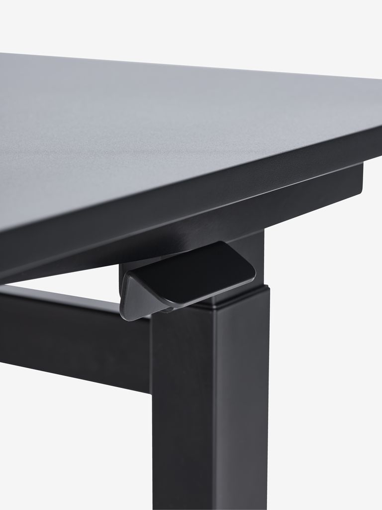 Acest birou cu înălțime reglabilă este format dintr-un cadru robust din oțel și un blat din furnir decorativ durabil. Toate suprafețele sunt negre pentru un aspect monocrom care se potrivește majorității spațiilor de birou.