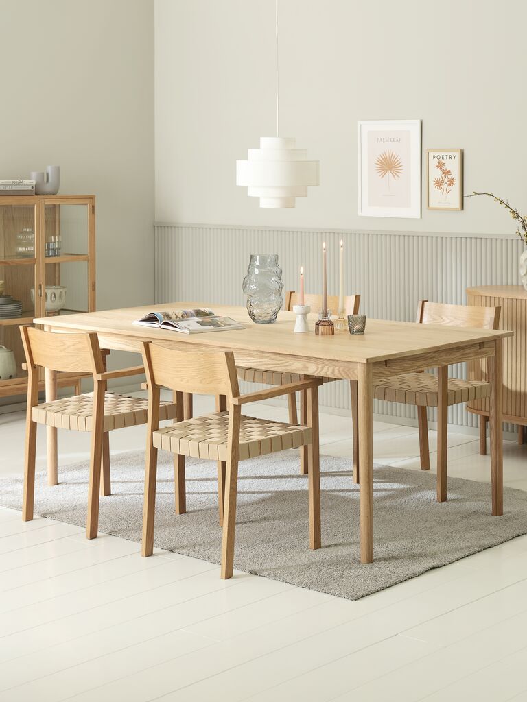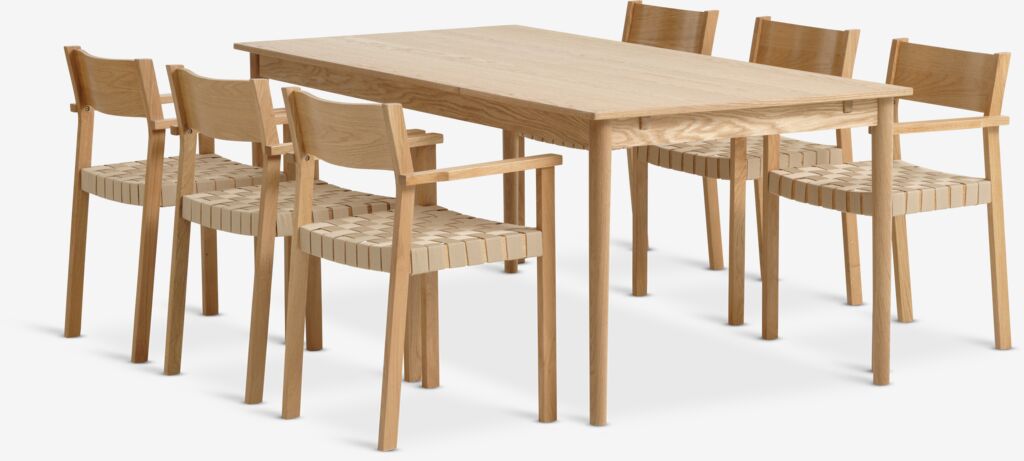 Masă: Lemn masiv de stejar și furnir de stejar. Incl. 2 extensii. 95x190/235/280x75 cm Scaun: Poliester, furnir de stejar și lemn masiv de stejar.