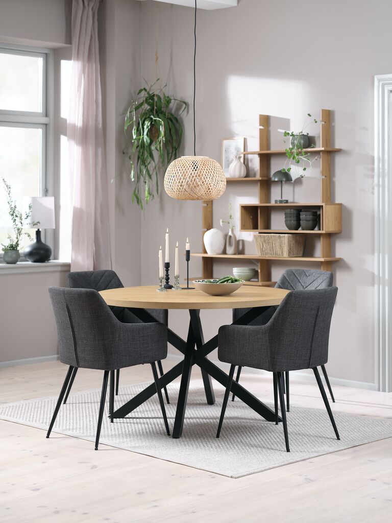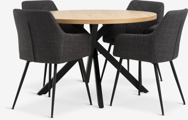 Masă NORTOFT Ø120 stejar cald + 4 scaune PURHUS gri