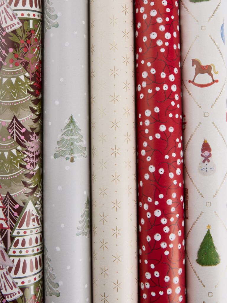 Hârtie de împachetat cadouri de Crăciun cu motive festive. Disponibilă în diferite culori și modele. 70x600 cm