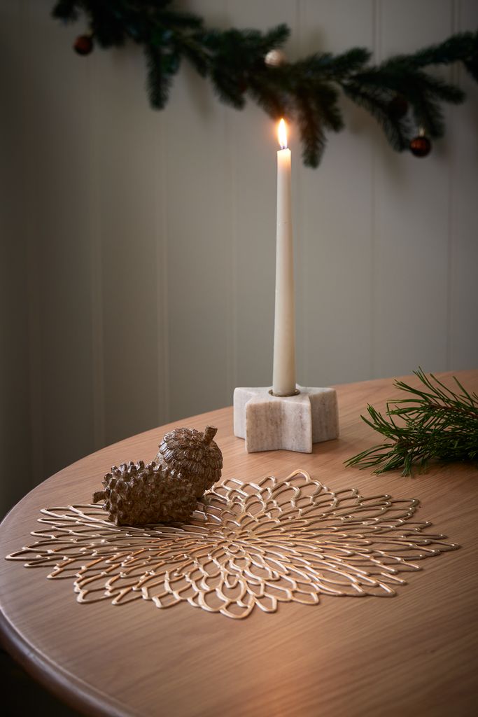 Șervet de masă cu un model decupat, într-o culoare aurie festivă. Ideal pentru a adăuga o notă elegantă mesei tale de sărbători. Ø38 cm