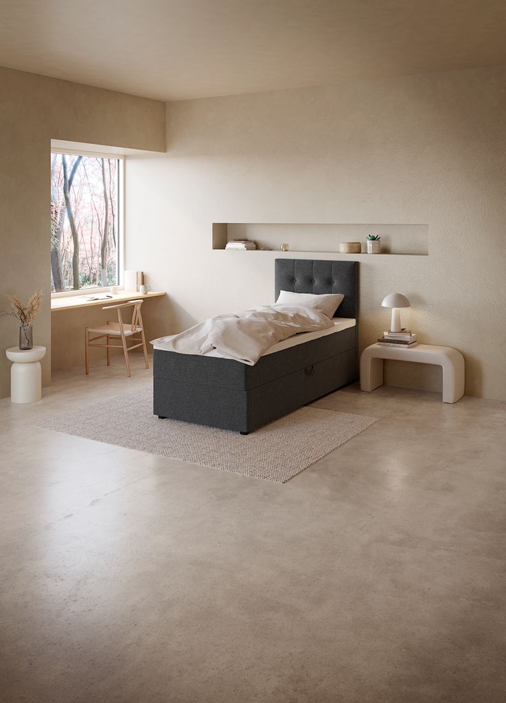 Var nem at samle, dog skal man være to om det. Dejlig høj, kan sidde i den uden at mine fødder rør gulvet og jeg er 180 cm. Derudover er det en meget fast madras, lidt i den hårde ende men er slet ikke en dårlig ting! Føles så rart for ryggen.