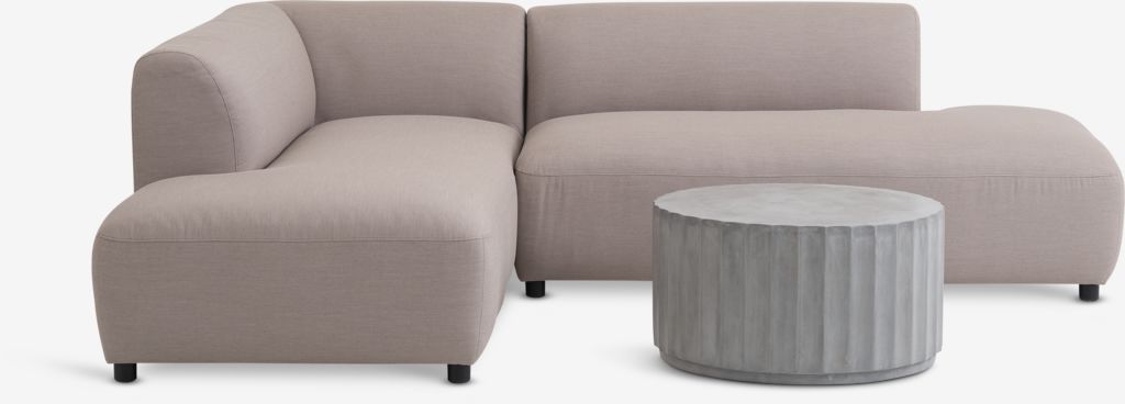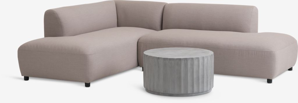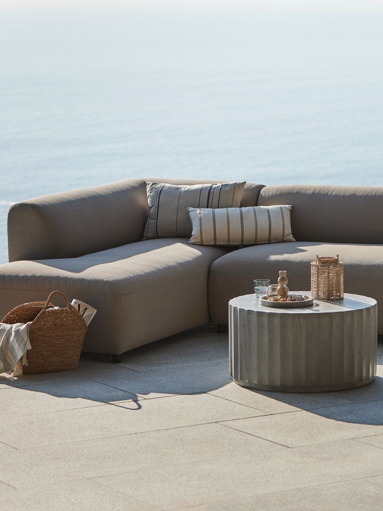 Set de terasă cu 5 locuri. Masă: Ciment. Ø70x37 cm Colțar: Colțar cu 5 locuri din aluminiu. Perne din spumă cu uscare rapidă, husă cu protecție UV, rezistentă la apă și la pete. Poate rezista la toate tipurile de vreme. Nu poate fi inversată. 257x74x197 cm