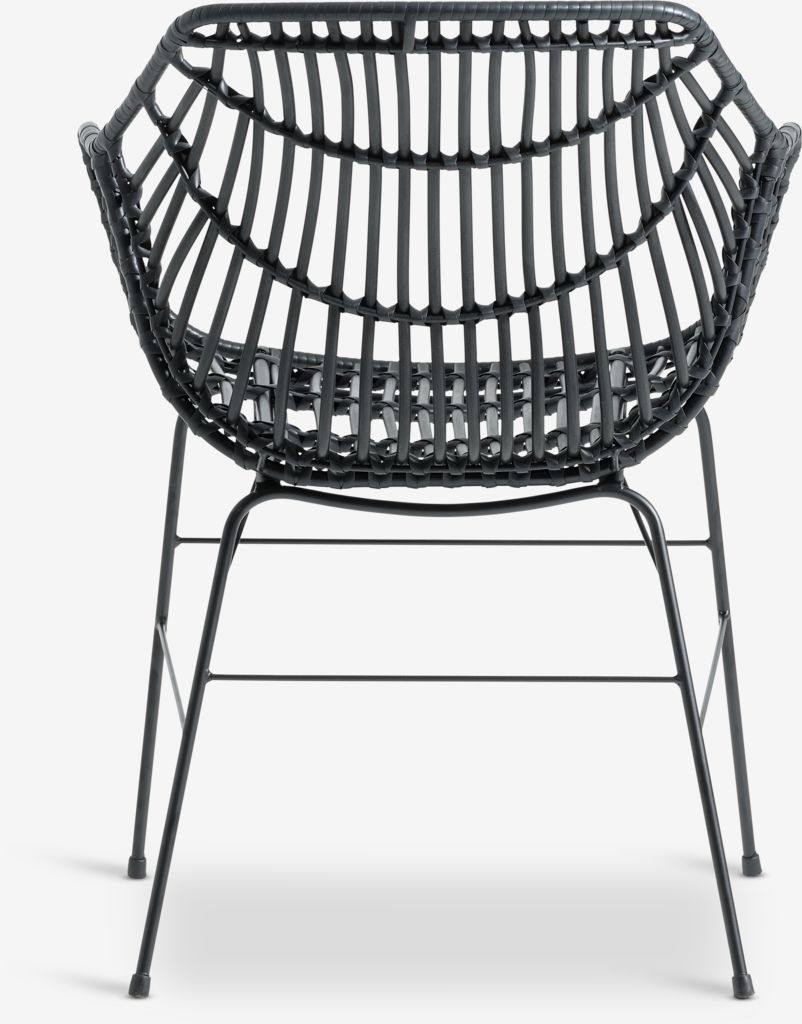 Scaun de grădină negru cu șezut și spătar din poliratan și picioare asortate din oțel vopsit cu pulbere. Poliratanul oferă un aspect natural de răchită, fiind în același timp rezistent la intemperii și fără întreținere.