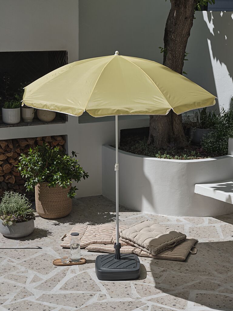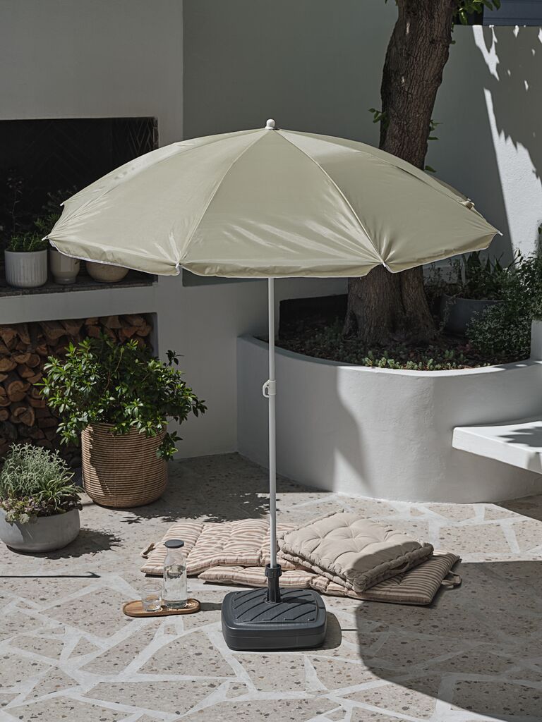 Un suport de umbrelă trebuie cumpărat separat. Nu uita să alegi un suport de umbrelă de soare de cel puțin 12 kg sau 12 litri, pentru a menține stabilă umbrela când bate vântul. De asemenea, poți adăuga o husă de umbrelă pentru a proteja umbrela atunci când nu este utilizată.