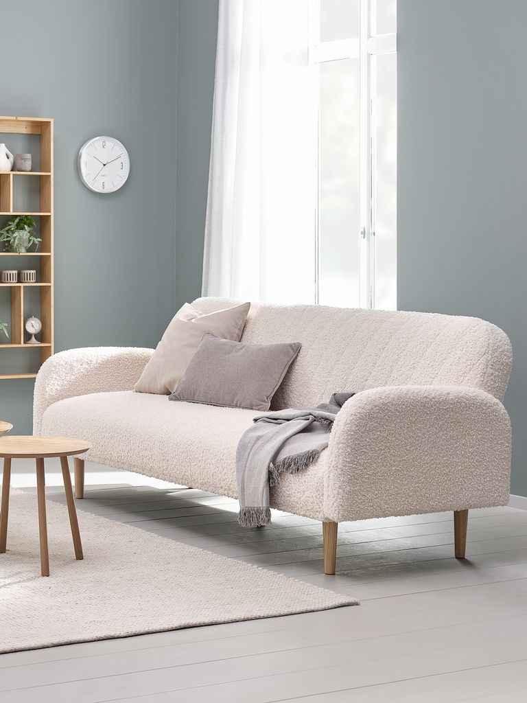 Canapea cu 3 locuri din material textil plușat. Canapeaua se transformă ușor într-un pat. Perne din spumă. Picioare din lemn masiv. Suprafață extinsă 106x190 cm. 209x82x83 cm